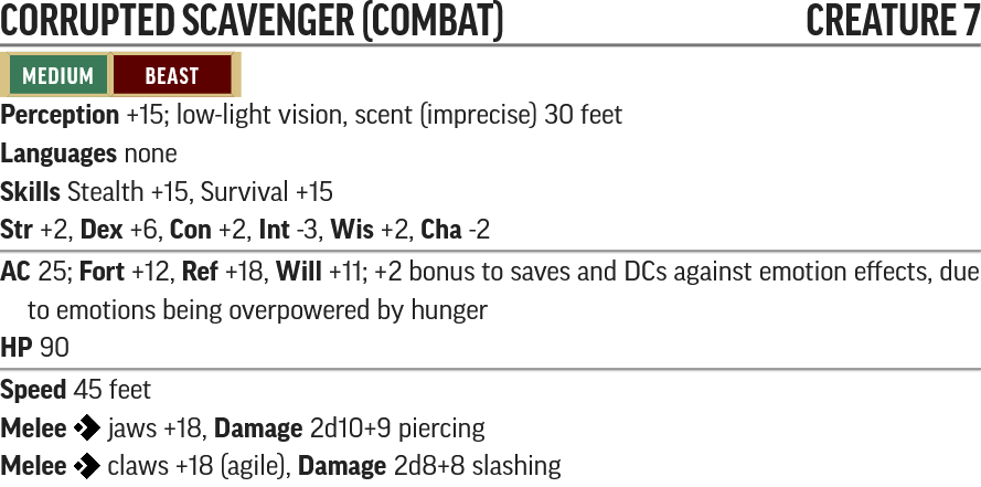 In this encounter, the party has 3 rounds to gain 8 influence points, otherwise the Corrupted Scavenger attempts to eat them and begins combat (leading to a trivial encounter, but if the party slay the Scavenger they all become Sickened 1 at the start of the next encounter due to feelings of guilt (this is an emotion effect)). Once gaining 8 influence points, no time limit applies, and the party can either pass or try to reach 10 influence points to befriend the Corrupted Scavenger.